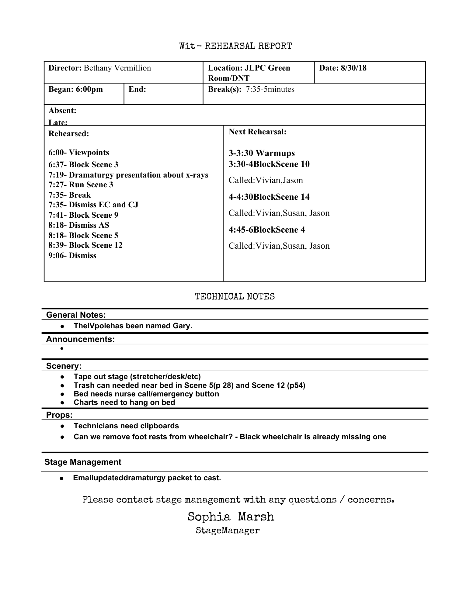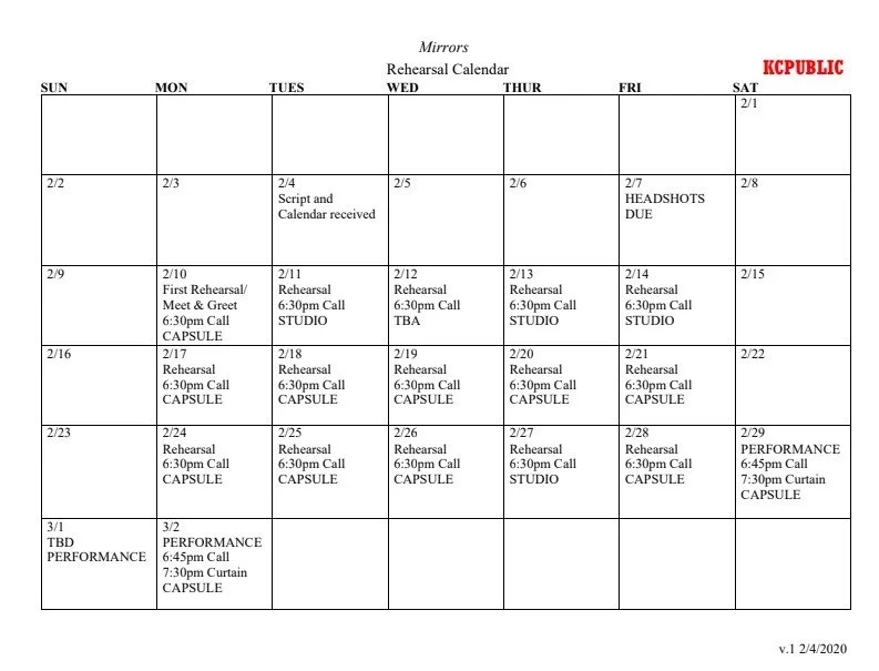 Sample rehearsal calendar I made for MIRRORS at KC Public Theatre.