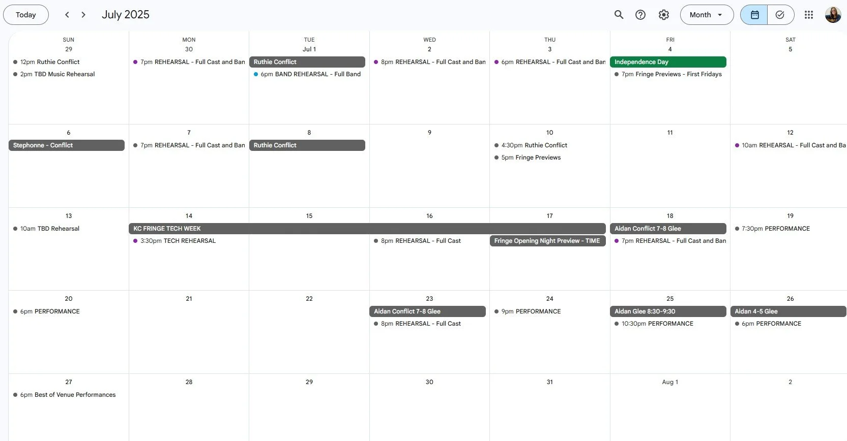 For Fringe shows and other more complex production calendars, I use a shared Google calendar for simple and clear communication.